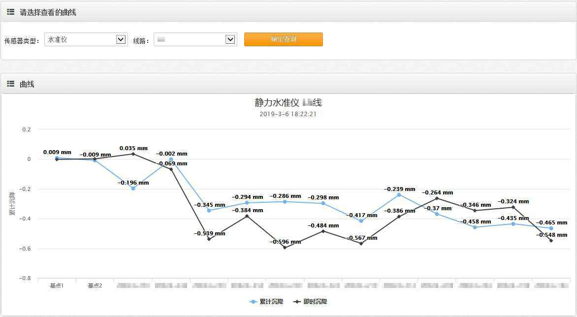 根据业主及现场情况要求,自动化监测设备需定期对管廊内的沉降数据进行采集,并能够绘制成沉降曲线图,直观地展现管廊各区域的沉降情况及趋势,遇到情况时能够提前预警,以 便及时采取防范措施。